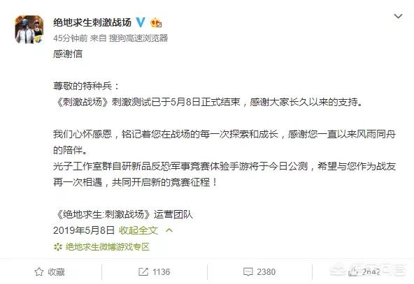 据绝地求生刺激战场官方微博消息,《刺激战场》刺激测试已于5月8日正式结束。