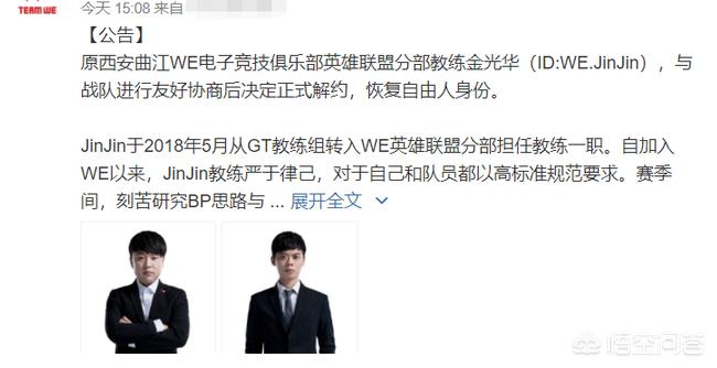 不知为何,自从WE在S7赛季打进世界四强后,成绩就再也没能更进一步了,如今,失去了队内的王牌中单兮夜后,就连教练都被挖走了。近日,WE官宣,教练jinjin和Dog8与俱乐部正式解约,成为自由人身份。