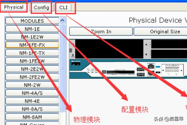 8、接下来就是每个设备的具体配置了,以路由器2811为例,来看看设备的配置情况。点击路由器就进入到下面这个配置界面了,主要包含三大模块:第一个是物理模块,这个模块可以添加和删除设备的各个物理模块,第二个是配置模块,这个模块可以配置IP地址、网关、掩码信息、vlan信息等等,第三个是命令行接口,这个是用命令对设备进行操控。