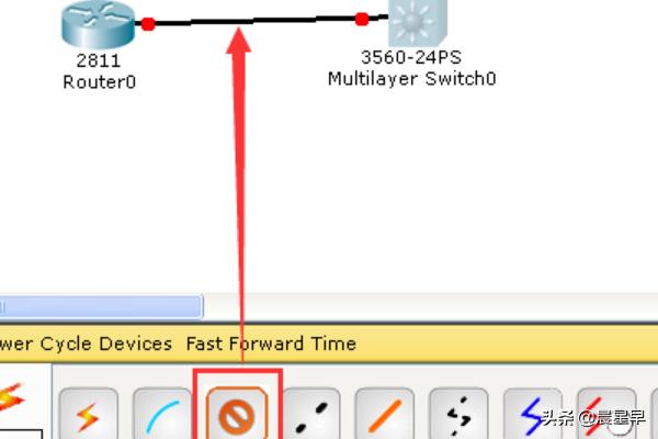5、然后,把这两个设备连接起来,在设备栏最右方有一个红黄相间的闪电图标,那个就是各类线缆的分类了,点开这个分类,可以发现包含了各类不同需求场合的线缆,如交叉线、直连线等等很多种类!