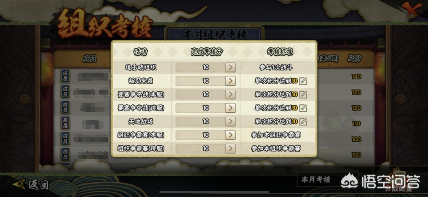 考核的标准就需要根据你们自己组织的情况来定了,可以不需要太高,只需要有一定的平均值就行,这样可以让更多的玩家有一定的竞争力,有时候定的太高反而会让一些玩家直接放弃,觉得要不要无所谓了。下图这个只能算是一个参考,除了跨服要塞的10分有点难度以外,其他的基本上只要参与都能够很轻松的达到,这也算是跨服要塞礼包的一个门槛吧。