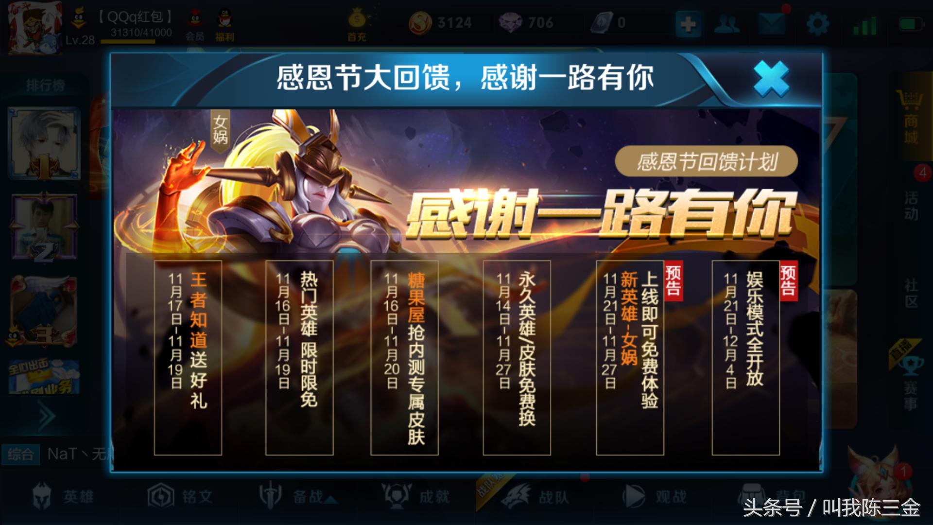 王者荣耀游戏内已经推送了一份感恩节回馈计划,不仅有糖果屋,还有永久SNK三位英雄兑换。而在今日也开启了王者知道答题活动,下周将开启女娲限免活动,新英雄女娲一上线就限免,签到7天更是赠送30天体验卡,不仅如此,女娲首周还降价5000金币,只卖8888金币。另外,下周会开启全部娱乐模式:克隆模式、无限乱斗、火焰山大战。