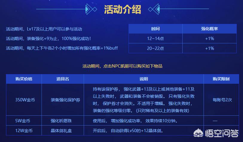 首先我们来了解一下这个活动吧。在活动期间12点~14点,20点~22点这4个小时的时间里增加所有强化概率+1%的buff,另外+9之前不会失败!