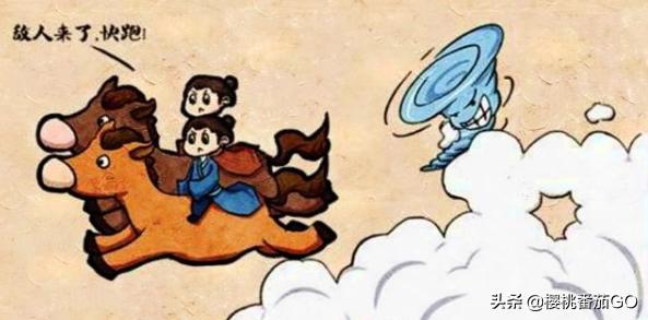 猜成语3:这幅图上画的是两个人身穿长袍,一个骑着一匹马,他们喊着:敌人来了,快跑。听到命令后马快速的向前奔跑。他们身后跟着一个高速旋转的飓风,飓风旁边扬起大量的白色的雾。