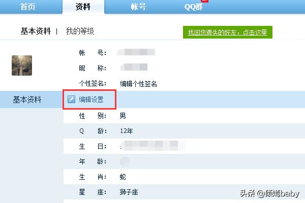 2.进入到我的QQ中心后,点击资料切换到资料选项,在基本资料一栏中,点击编辑设置
