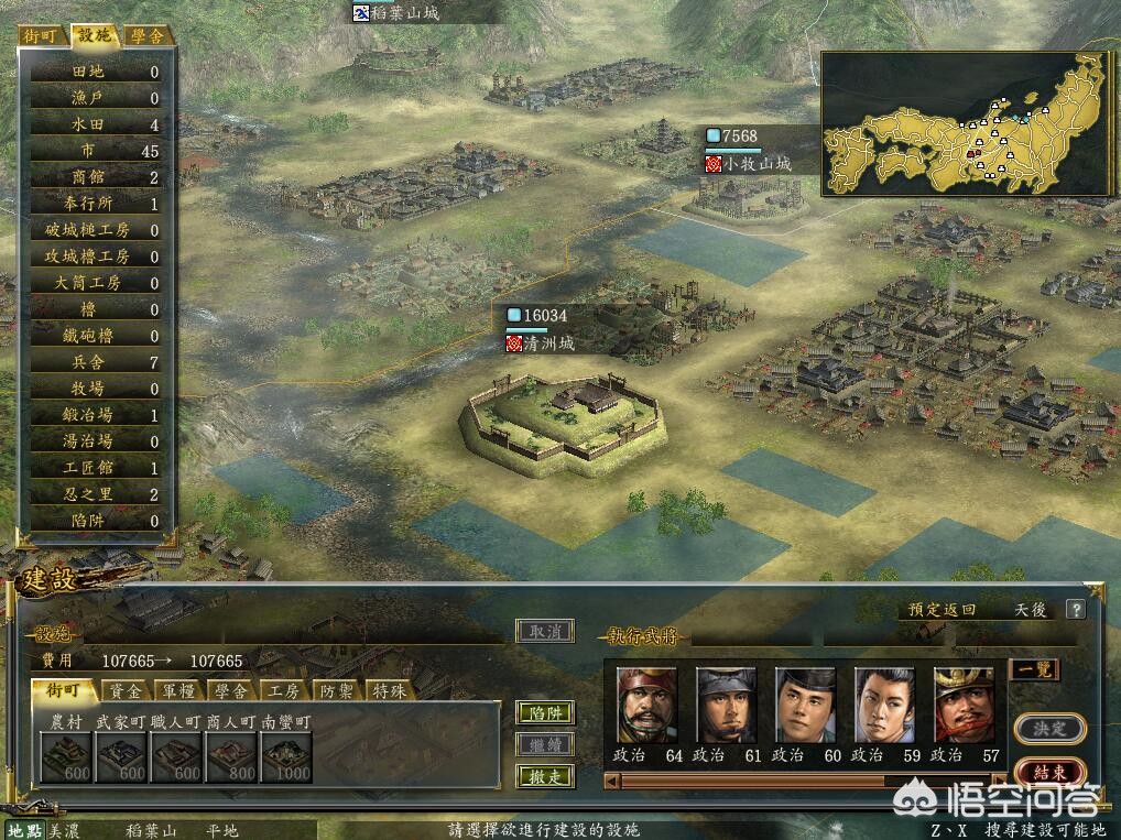 新手玩家最好用一些厉害势力开局,比如尾张统一剧本的织田信长。首先我们要做的事就是内政建设,与我们熟悉的《三国志11》一样,内政也是以造房子的形式呈现,不过该游戏是即使战略制,而且城市空地数非常多。