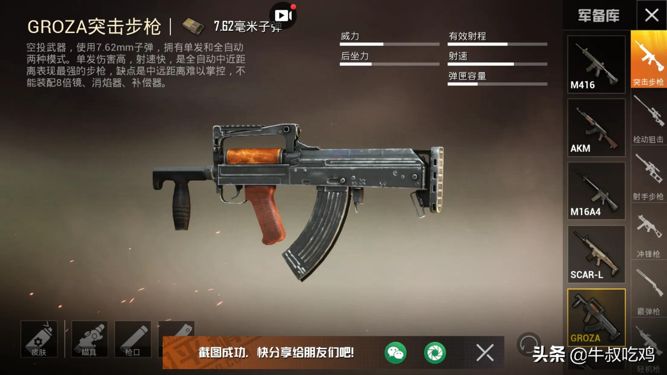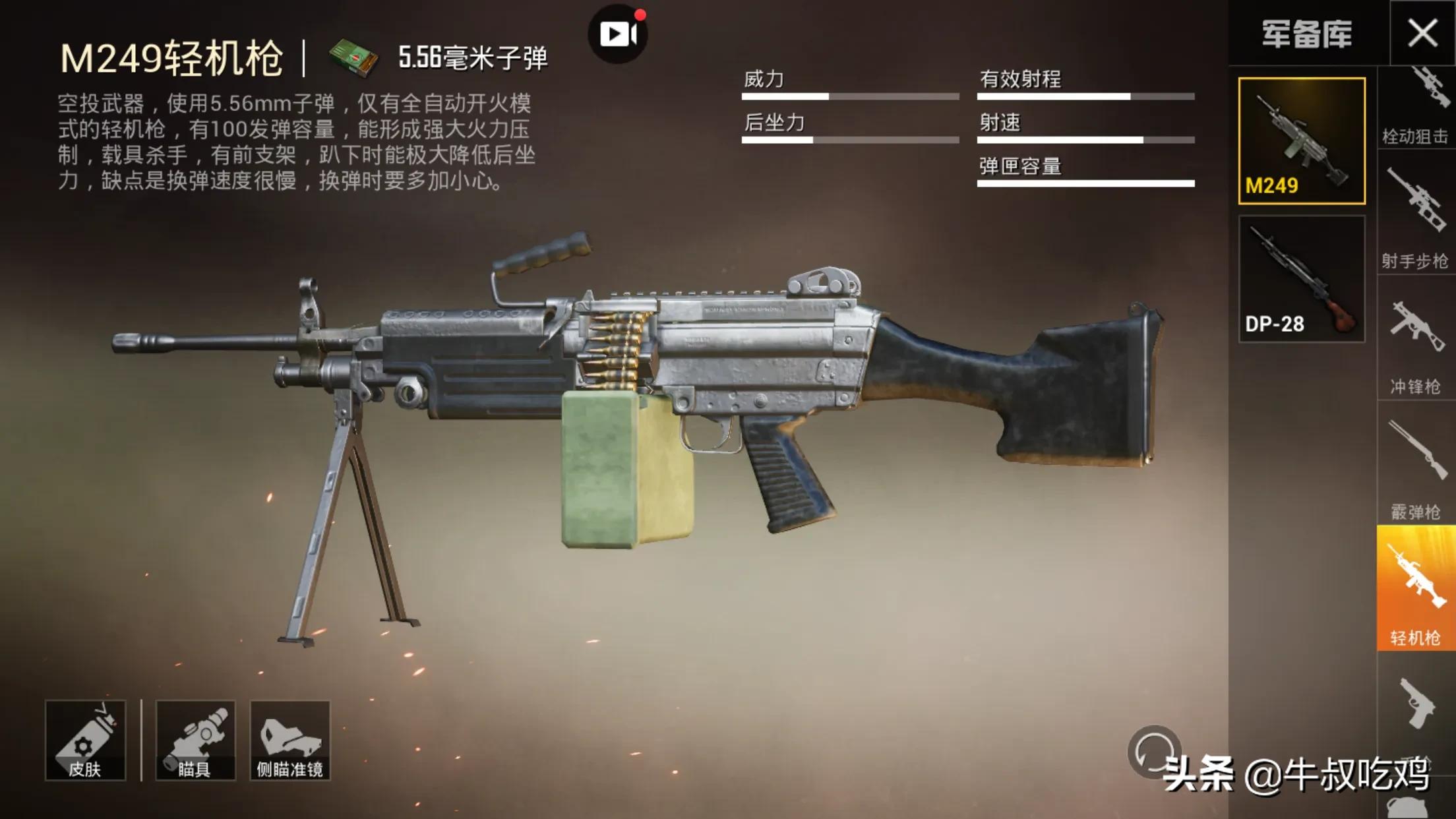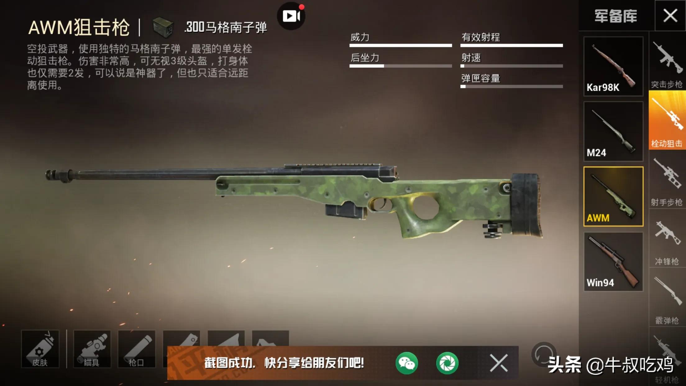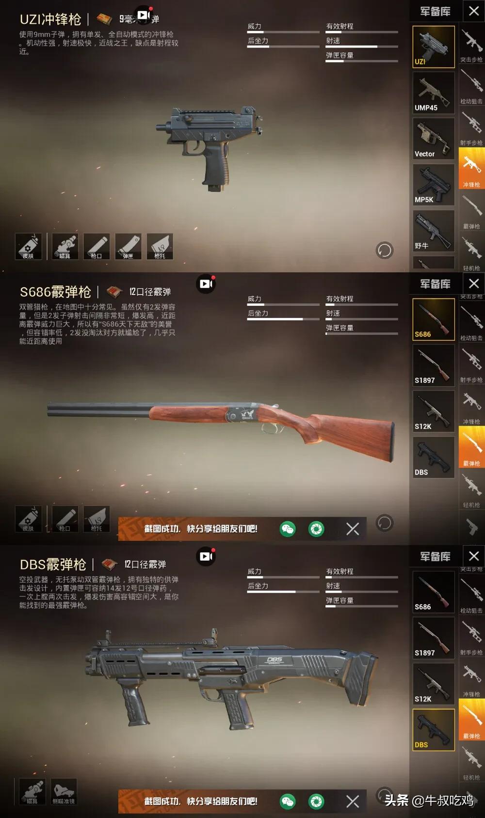 和平精英吃鸡神器其实有很多,就看你喜欢或习惯用哪一种而已,就拿我自己来说吧。落地近战钢枪的时候我比较喜欢用UZi和s686还有新出的前空投武器DBS(如图1)这3把枪近战都是无敌的。中途如果喜欢摇车战的话建议使用双步枪,我就喜欢配M416和AKM(如图2),M416满配的话综合性能很强,能打近也能打远,AKM近战机描也是很强的,平时我也是靠这两把枪吃鸡。当然如果你喜欢打狙的话,最强的就是空投的AWM了(如图3),三级头都是一发入魂的。步枪好用的还有狗杂(如图4),对枪都不在输的。还有很多很好用的神器,比如大菠萝(如图5)弹夹100子弹,这是扫车灭队神器。