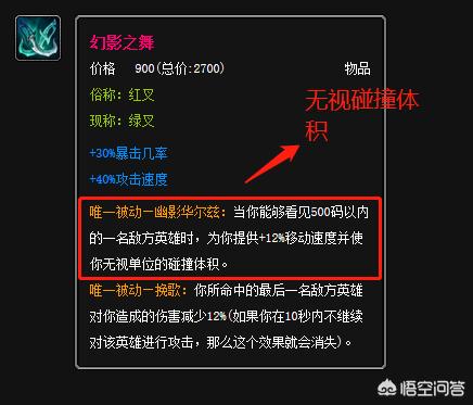 魂化(来自幻影之舞被动效果) 装备幻影之舞的被动——是当你命中最后一名敌方英雄,他对你造成的伤害会减少12%。当你能够看到500码内一名敌方英雄时,他会为你提供12%的移动速度以及魂化。其实这里的魂化指的就是“无视碰撞体积”,不少玩家都碰到过被兵线卡死导致无法走位被敌方送回泉水,有了这个装备就不用再担心这一系列问题啦!
