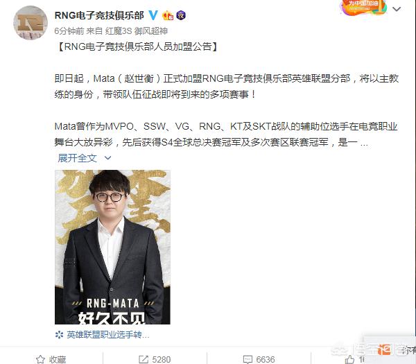 没错刚昨天宣布完退役的Mata,今天就来到了RNG当主教练了,原本2018年年度加入战队的Steak也正式卸任RNG主教练,从此RNG主教练就是Mata!!!说起他和RNG之间的关系,之前2016年大家都以为Mata会韩国了,没想到也是转会到了RNG中,现在却是以主教练身份回归。
