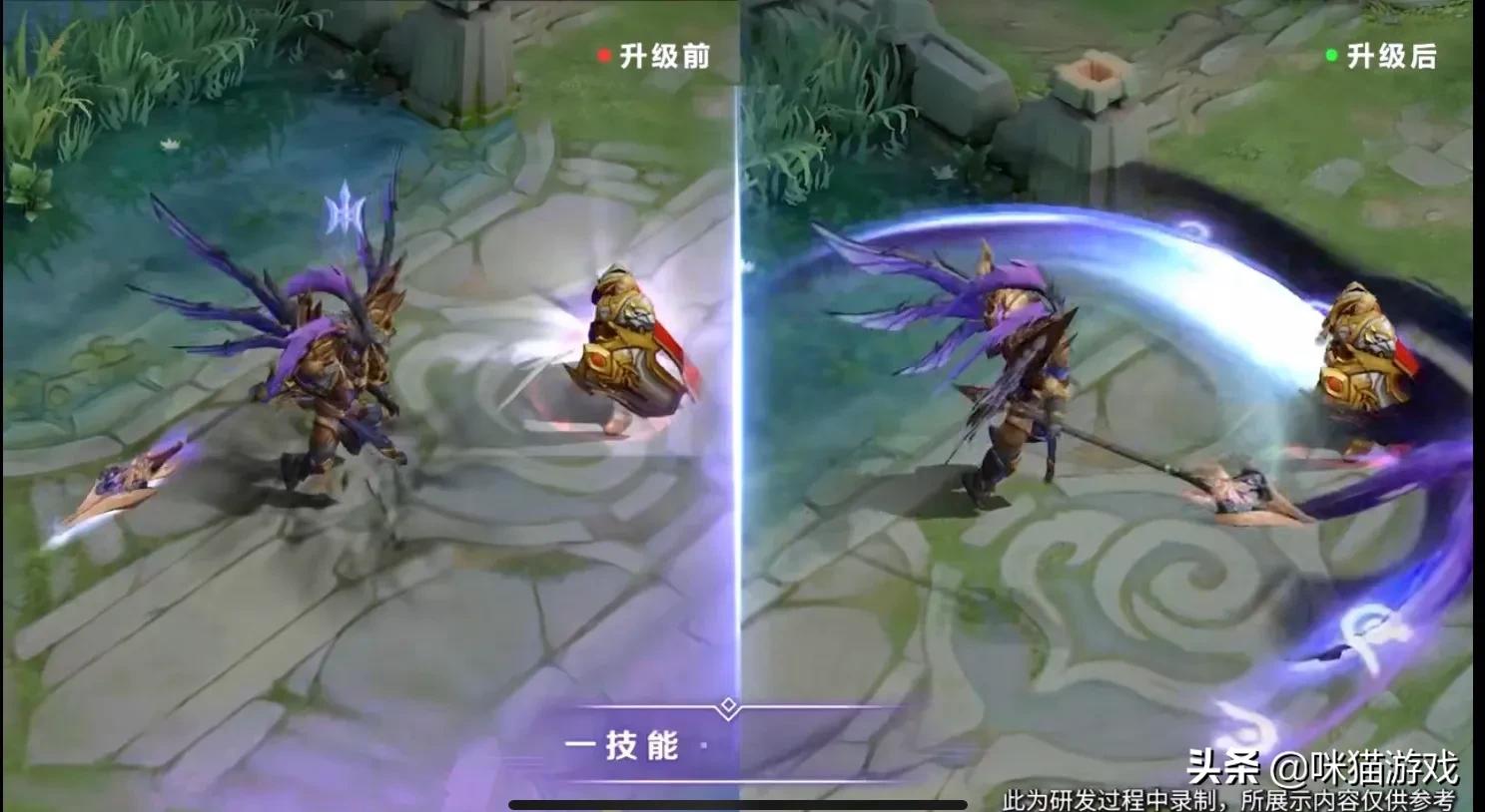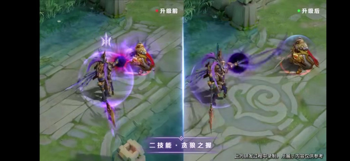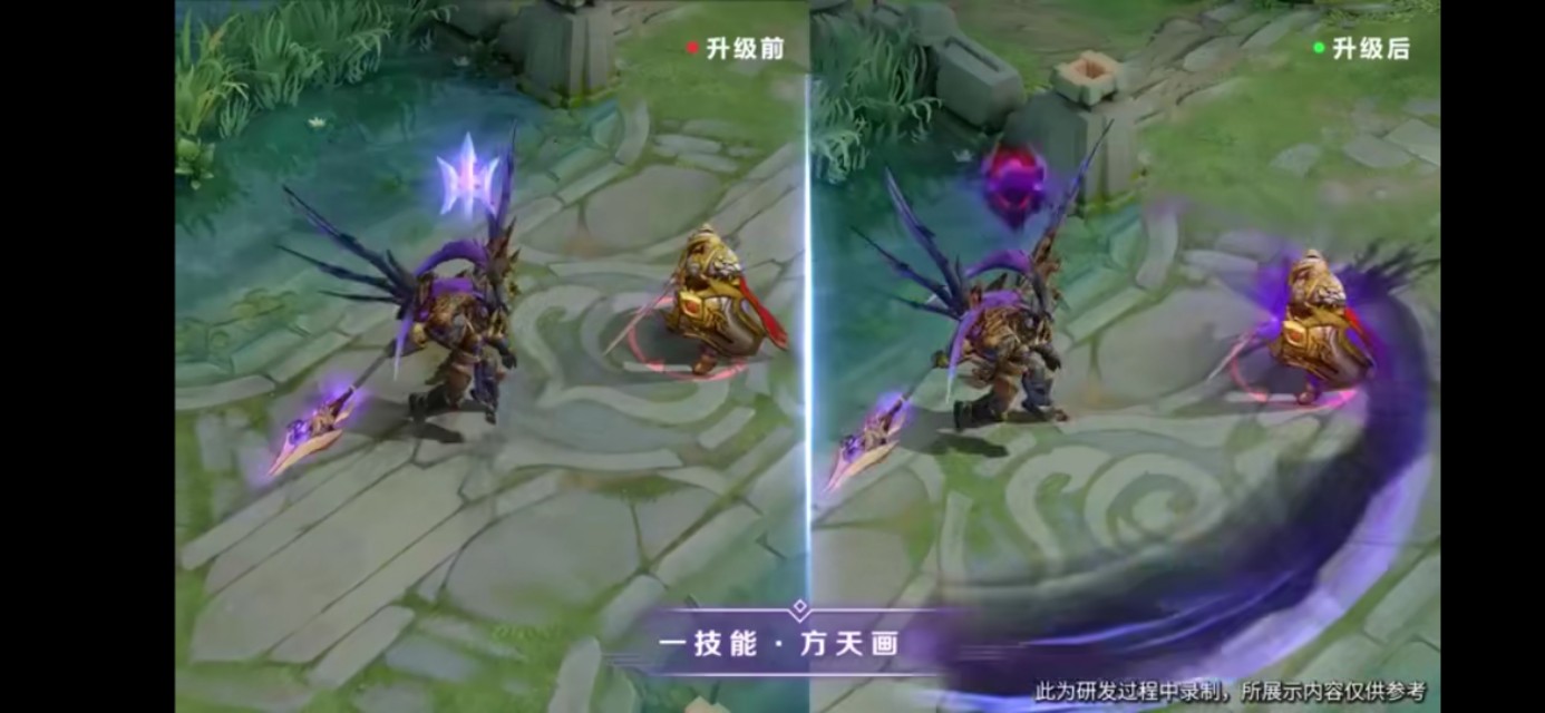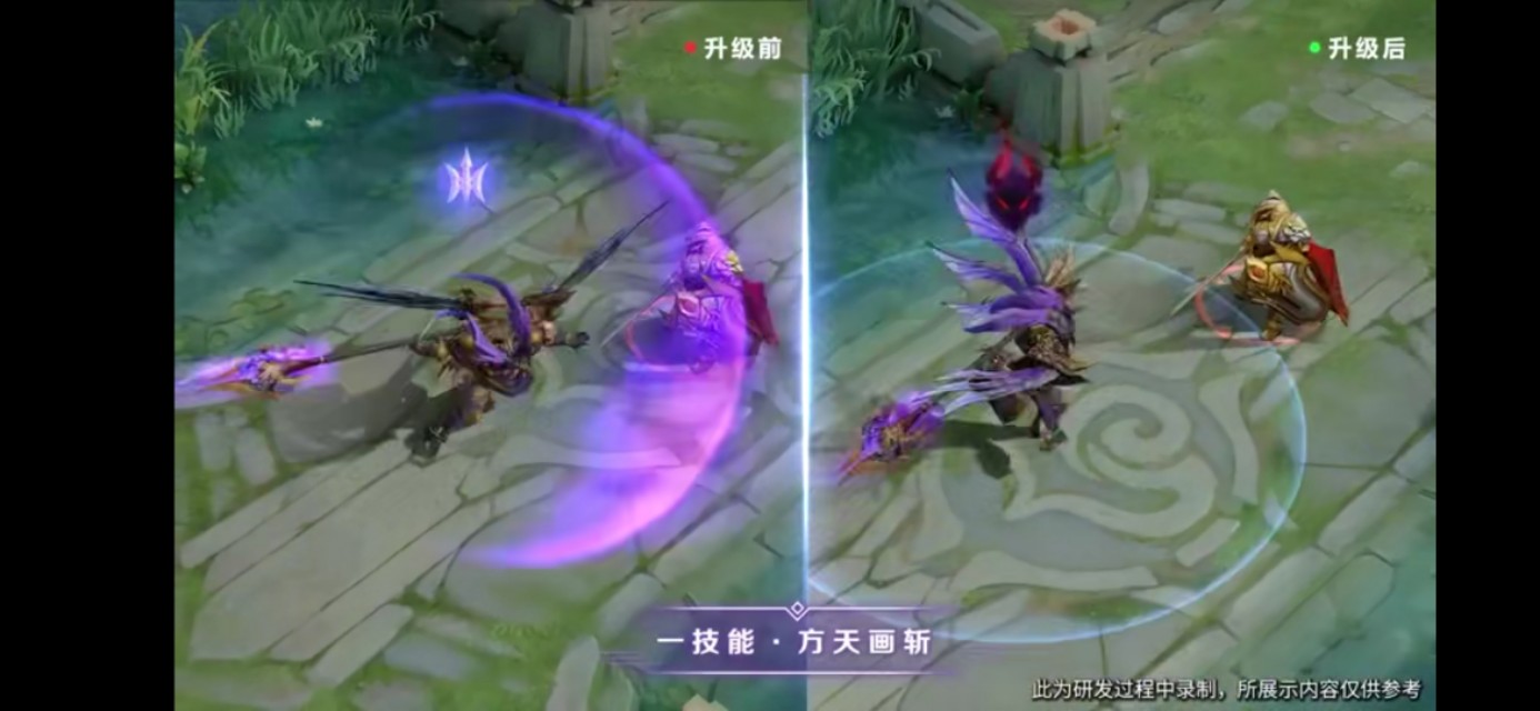 一技能的刀锋上多了一些魔纹,不止如此,附魔后的普攻被攻击者的头上会出现一道紫光,好像每一次攻击都在削减你的生命一般,头上的附魔标识更醒目,不再是跟原皮无二的方天画戟标志。
