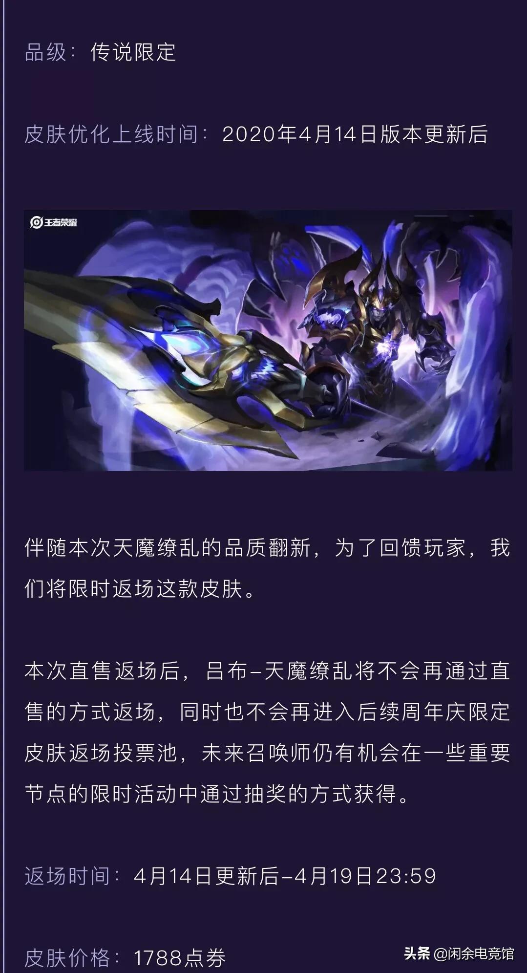 本次直售返场后,以后吕布的天魔缭乱将不会通过直售的方式返场,也不会再进入后续周年庆限定皮肤返场投票池,不过以后在一些活动中通过抽奖活动获得这个皮肤,所以这次返场希望大家不要错过。