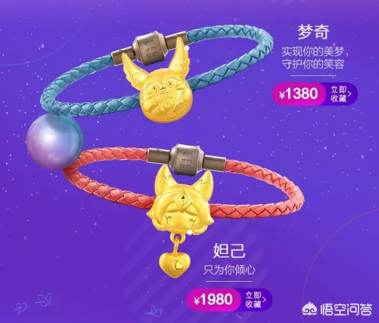 另外两款是梦奇和妲己的手链,梦奇售价为1380元,妲己售价为1980元。而妲己是所有饰品里最贵的了,至于是不是因为含金量比其他的都要多,这就不太清楚了,因为官方没有相关的数据。但从造型上来看,梦奇和妲己的样子还是相当可爱的,只不过这个手链个人觉得还是丑了点,没有项链好看。