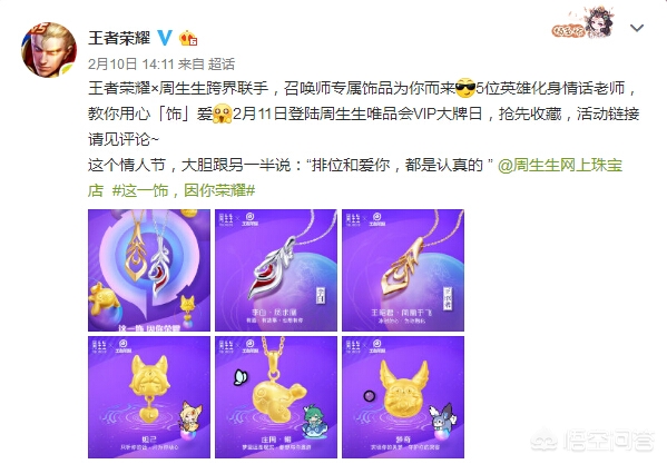 王者荣耀联合周生生推出情人节限定饰品,李白凤求凰最便宜妲己最贵,你会购买吗