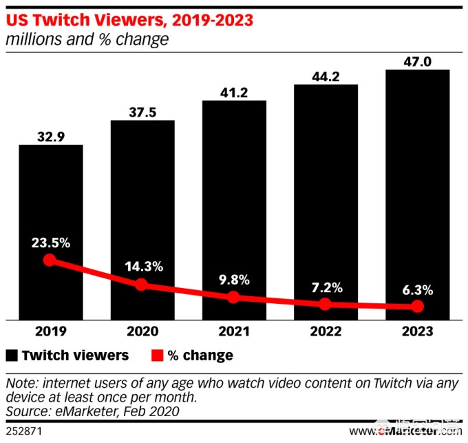 eMarketer 周四发布的新预测称,亚马逊旗下游戏流媒体平台 Twitch,明年有望在美国吸引超过 4000 万的月活跃用户。