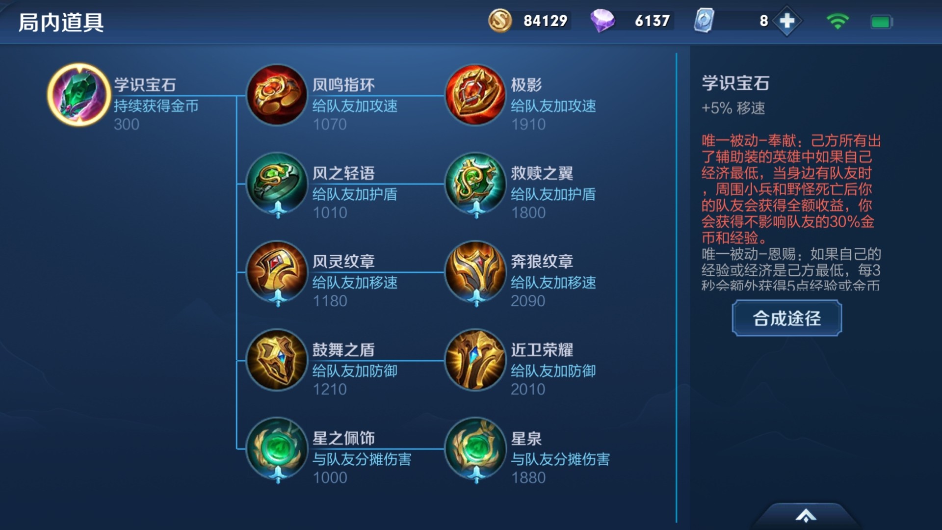 综上所述,那么多好处为什么不帮中路?辅助宝石对于其他线路来说只有好处没有坏处,辅助反正也没办法吃线有个辅助宝石每3秒加五点经验5金币它不香吗?重点还加5%的移动速度,逃命也很舒服啊