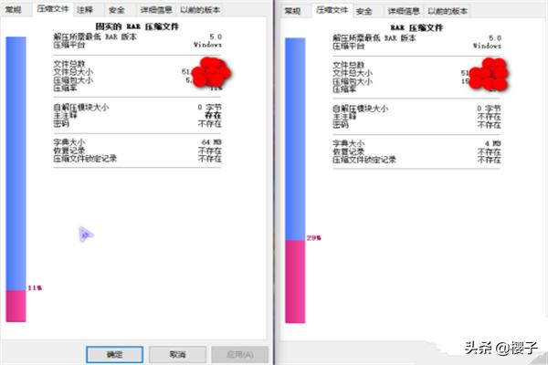 7下面是标准配置和配置后的压缩率差距左面是修改配置后的,右面是标准配置差距非常明显,修改配置后基本上都达到未修改配置大小的三分之一了!PS:压缩的文件是绿色版软件,对于已经压缩过的文件,再怎么设置效果都不会太好!