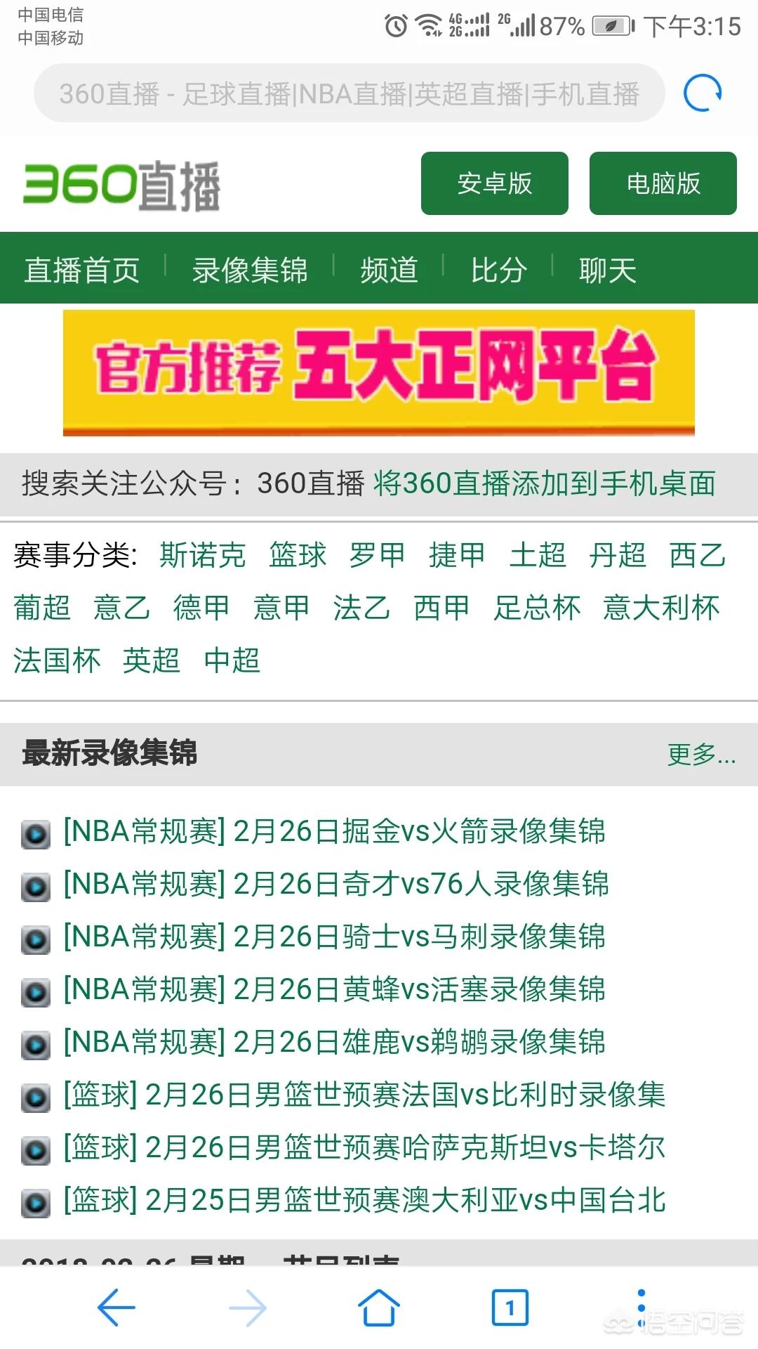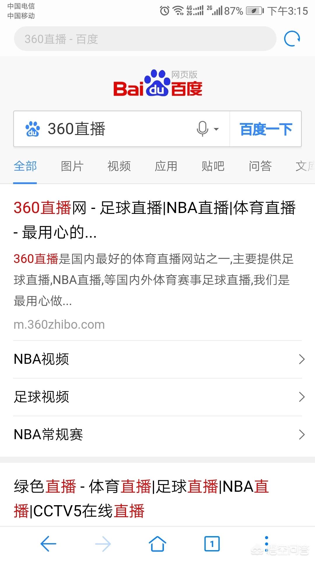 以前主要用直播吧看,但现在封的厉害收费的基本不播了,只有免费的能看。不过直播吧还是可以看很多信息和新闻还是不错的! 现在基本都是用360直播网看。百度搜索360直播,里面基本每场比赛都有!具体步骤看截图!今天的直播都在里面!