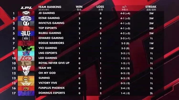 从榜单当中可以看出,JDG、ES、IG、TES和BLG战队均以两战全胜的战绩位列榜首,这五支战队当中JDG、IG和TES是公认的强队,成为领头羊理所应当,BLG也是以稳定著称的队伍,虽然他们上限不是非常高,但是下限也比别的队伍高,不出意外进入前八也是稳稳当当!