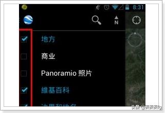 4、点击左上角的地球图标可以打开设置,我们可以选择查看该地区显示的方式。在这里我们还可以使用谷歌地球图库等特色功能。