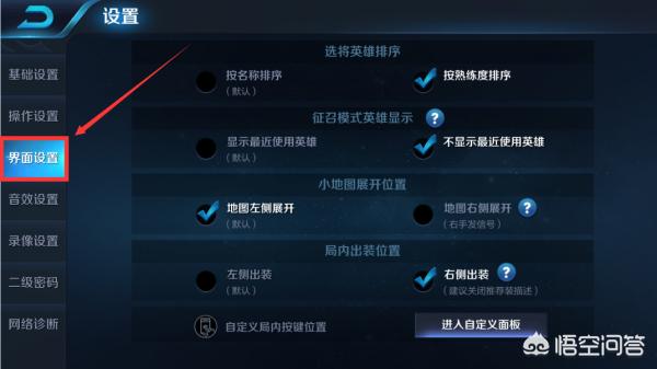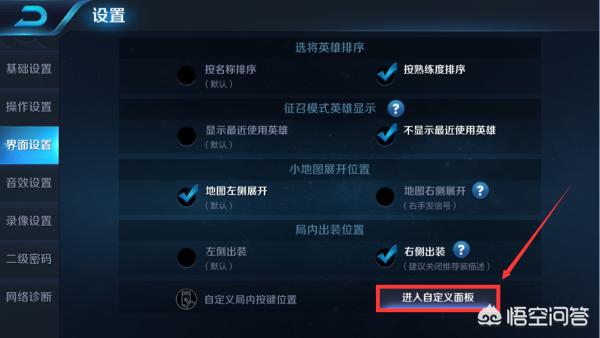 3、在“界面设置”中有一个选项叫做“进入自定义面板”,点击进入自定义面板。