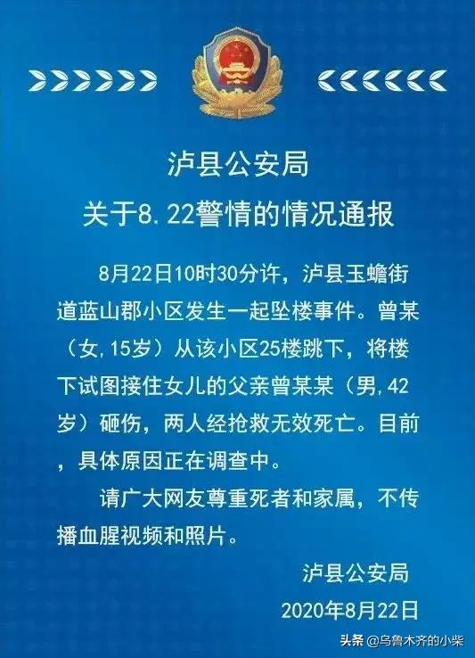 来自官方通报称: 8月22日10时30分左右,泸县玉蟾街蓝山郡小区发生了一起坠楼事件,一个15岁女孩曾某从该小区25楼跳下,将楼下试图接住女儿的父亲曾某某砸伤,两人经抢救无效死亡。
