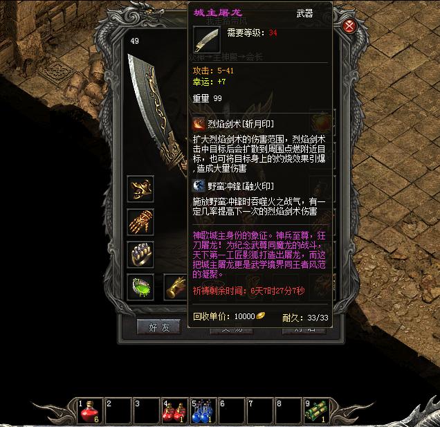除了第一把屠龙,后边的屠龙基本上都是用沙巴克积分兑换的了,屠龙的名字也有所改变这把屠龙也是一波三折,最终由众神殿的老大走路带风拿下。据玩家透露走路带风为了拿下这把屠龙投资了上百万元。真是不得不说,土豪老板还是很多的。而这把屠龙的名字也变成了城主屠龙,造型和屠龙一样。属性比屠龙高2点攻击。