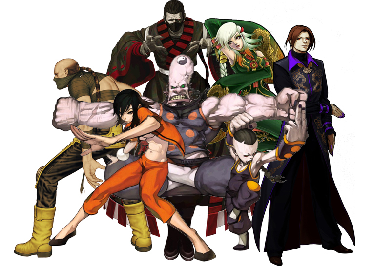 拳皇98里的中国人只有超能力队的镇元斋来(老头)和椎拳宗(吃包子的),而另外一名女性队员麻宫雅典娜则是日本人自超能力队是麻宫雅典娜到中国来学习武术,和椎拳宗一起拜在镇元斋那里学习醉拳在KOF99里,增加了会使用超能力的中国小孩包,在KOF2000里,红丸队增加了来自于河北的飞贼知麟,在KOF2003里增加了中国小女孩桃子和使用八极拳的牙刀,在KOF13里伊丽莎白队增加了上海武神神道武和河北飞贼二当家堕龙。