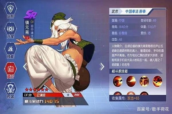 先从大家最熟悉的中国队说起吧,镇元斋这个老大爷大家都见过,人物形象特别分明,一看就是打醉拳的,腰里还别了个酒葫芦,没事还会拿起来喝两口,动作设计也很有醉拳里面放浪不羁的那种风格,大爷虽然在故事中是个高手,可在游戏中的强度就稍微弱了一点,对战中出场率非常低,娱乐局才会有人用吧。