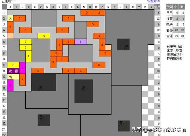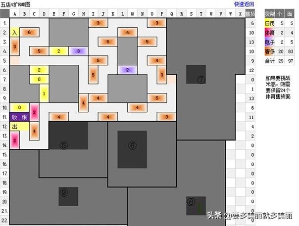 4口碑时:其最大盈利布局为:11-12饮料售货面,11蔬菜售货面,11-12日用售货面,其余是体育售货面。可一直完美迎客到5口碑。此时4店已经开张了,正是需要口碑的时候,而二店5口碑要5000点,道路漫长呀,所以,二店的5星哈里波波也就失去了挑战的意义,如果你坚持挑战5星哈利波波,那还得留着15蔬菜才行。好运综合商店4口碑摆法图: