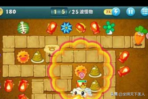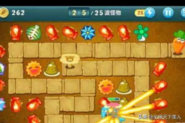 4、等到所有的道具清除干净之后,游戏玩家就可以选择在道路周围的空地上布置塔防了,种类可以多选几种,然后冰冻的海星也是间隔几个也会建立一个,在后期的时候,为了避免萝卜被咬,在清除道具的时候,还开出了一个鱼骨塔防。就好啦!