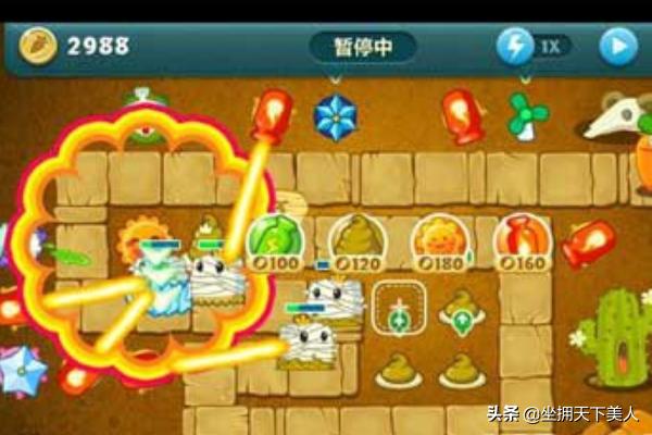 3、当游戏玩家把中间的大宝箱打爆之后,就能够得到系统赠送的四个塔防,这种类型的塔防的主要的功能就是降低怪兽的移动速度,虽然伤害并不高,但是在游戏里面却是非常重要的存在。有四个塔防,游戏玩家可以选择留下两个用来减速,另外两个可以卖掉,用来购买其他的伤害较高的塔防。