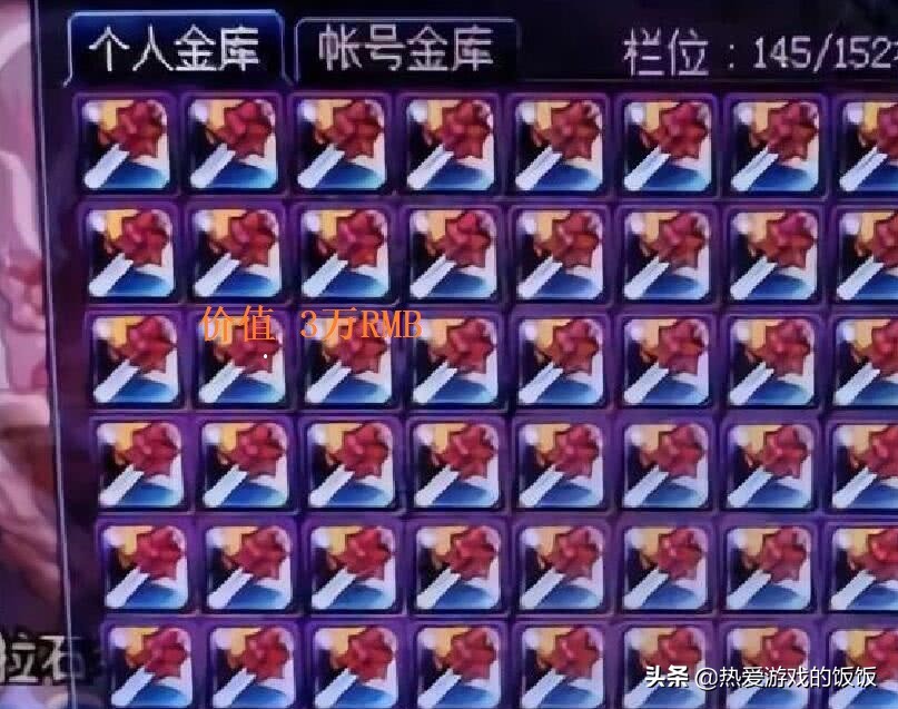第一个仓库堆满了裂创,当时一把裂创3000w,他总共囤了145把,总值43.5亿,兑换现金3W左右RMB;第二个仓库灵犀、王者和玛尼,总值10W左右;第三个仓库有骨戒、漩涡等等,总值2W以上。总体来说,该玩家8年损失了15W左右,在8年前,这些钱可以在县城买一套房子了。