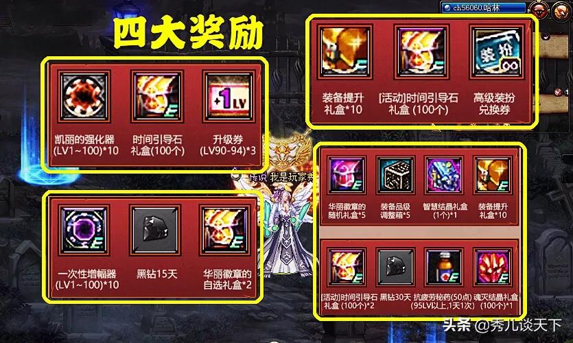 【4】集齐三组,获取至尊礼包,5个华丽徽章随机,5个品级箱,1个铭刻石,10个装备提升礼盒,200个时间引导石,30天黑钻,50点疲劳,100个传说材料。
