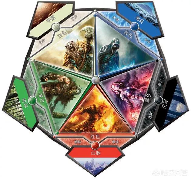 法力(有火、时、圣、原、暗共5种属性)、神器、法术、生物、武器、诅咒、其他特殊类别。不同的卡牌有不同的功效。