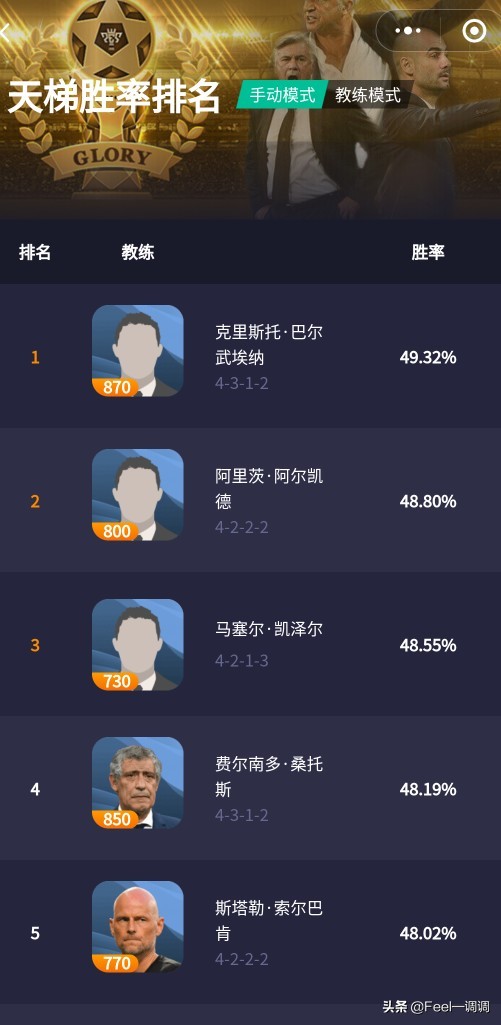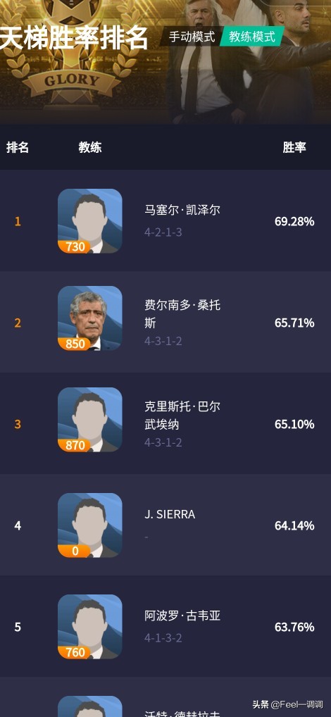 1.教练模式天梯最好胜率阵型4213 教练名字为马赛尔.凯泽尔 胜率为69.28%