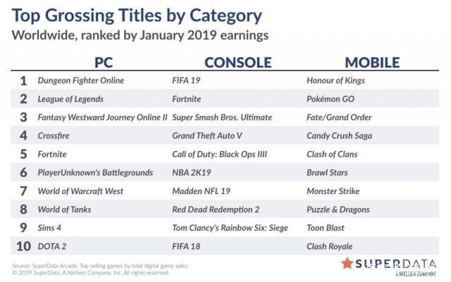 superdata公布的19年1月份的全球游戏收入排行,当时的PC前十名分别为: