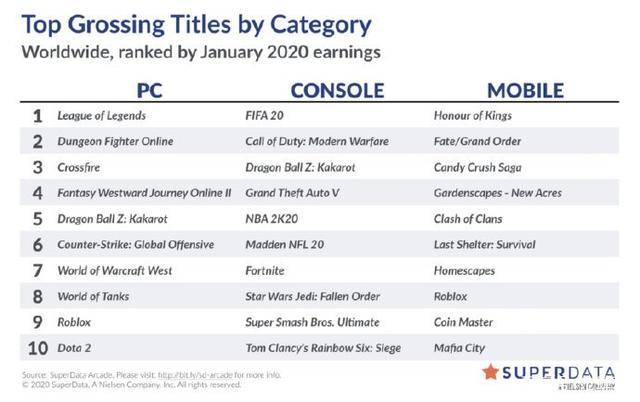superdata公布的2020年1月全球游戏收入排行,PC游戏前十名分别为: