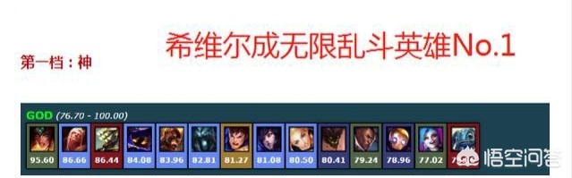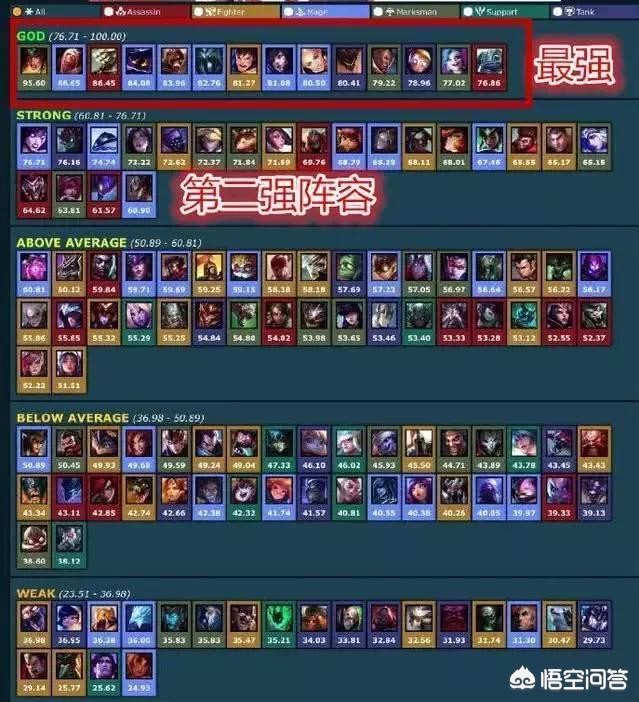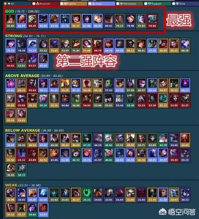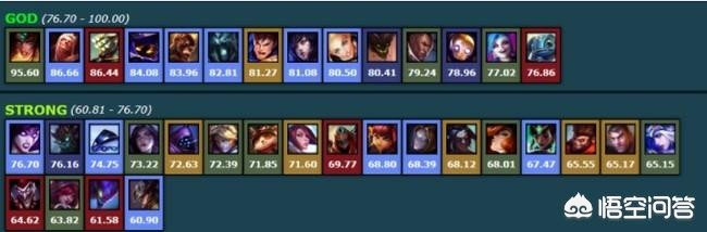 从图片中我们可以看到轮子妈引领的这一组英雄的评价叫做:GOD 也就是神的意思,这里不光有轮子妈还有盖伦、剑圣以及鱼人这类传统无限火力强势英雄。