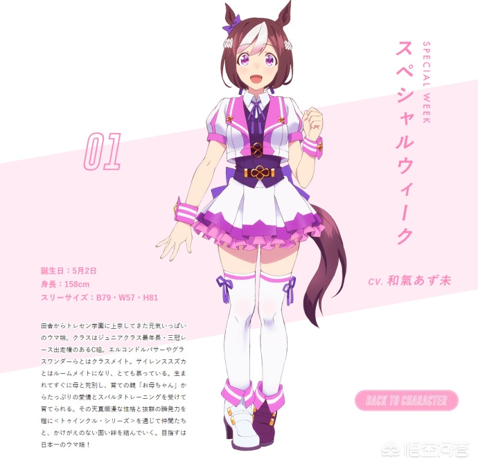 与之对应的,《赛马娘》中的各个角色也都有现实原型,名字也都是以现实中的马名命名。比如女主“特别周”原型就是1999年获得天皇杯优胜的名马,是当时日本获得奖金最高的赛马。