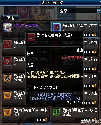 可以在西海岸-npc达芙妮处商店购买,属性最差,比如红色6点力量,除非实在是没有高级以上徽章,否则不建议。