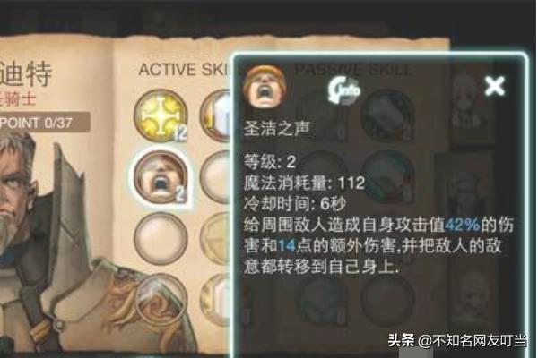 3、作为冲锋陷阵的“肉盾圣骑士”,吸引火力是首要任务,推荐首选技能“圣洁之声”,圣洁之声可以将敌人的所有攻击吸引,并且能够对敌人造成额外伤害,等级越高,伤害越大,并且是范围攻击。以40级为限,一周目可以将“圣洁之声”练到11级。