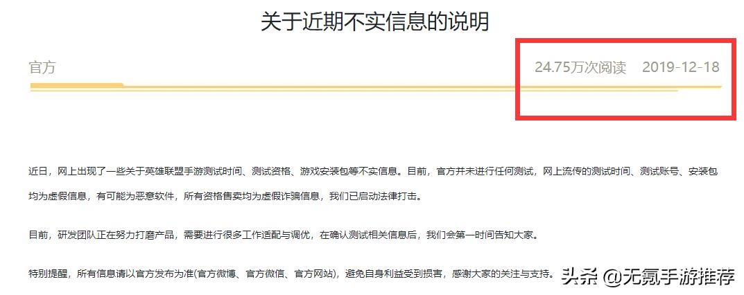 比如说去年年底【英雄联盟】手游火爆的不得了,不知道玩家的还以为已经上线了,还有人说几号测试几号上线的,像真的一样,我看了一下消息来源,都是第三方的,流量倒是很大,奇怪的是【英雄联盟】手游官网一点都没有提正式上线或者公测的事情。