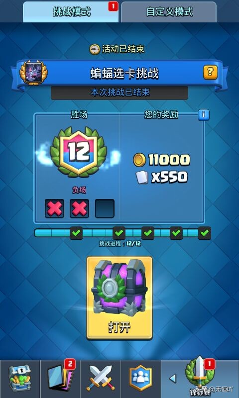 我大号已经卖掉了,大号最辉煌的战绩是蝙蝠选卡挑战赛12胜,超级骑士挑战赛12胜(直接抢先带走超级骑士)