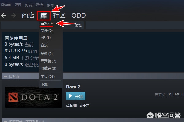 4、登录后在左上角找到“库”,点击出现下拉菜单,选择“游戏”;