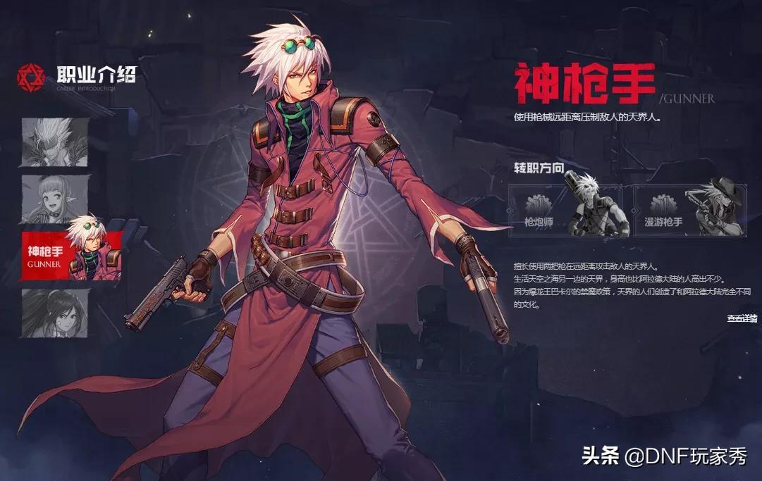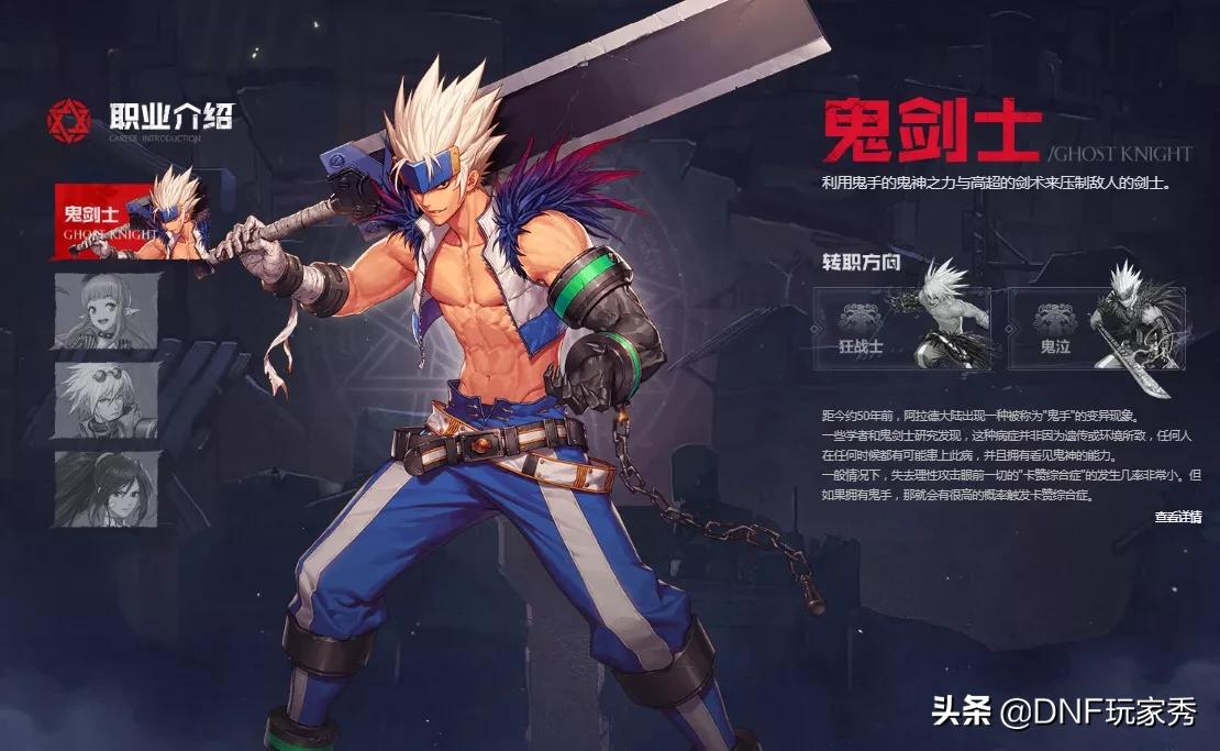 然后是第二个界面,职业介绍,这次的官网的职业介绍,共分四个系列,每一个系列只有两个角色,分别是鬼剑系的狂战和鬼泣,魔法师系的元素和魔道,枪手系的大枪和漫游,格斗系的气功和散打。