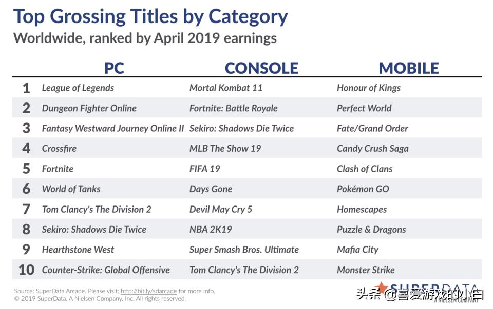 以上是2019年4月游戏收入排行榜,这里可以看刀梦幻西游已经上榜,但是由于魔兽怀旧服还没开,所以数据也只能用于参考。不过魔兽世界是点卡收费制度,所以营收在短时间内无法体现出来,还要细水长流,不在榜也情有可原。