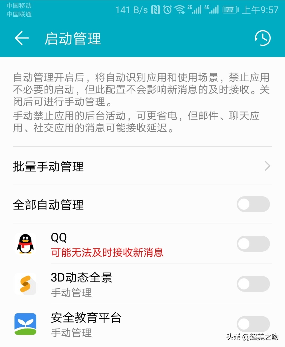 启动管理就是设置自己认为不需要占用后台软件的功能。这个功能相对上面来说比较重要,因为我们手机平常经常安装一些软件,在我们打开和退出的时候,其实他一直停留在后台,一直都在占用你的运存和处理器性能,所以及时关闭这些软件后台频繁启动权限才是必须的。关闭后台保证手机流畅运行的同时,也同样保证了我们更持久的待机时常。何乐而不为呢!所以同样的手机在不同人的手里流畅度就不一样,就好像是给你一个工具你不会用,天天让它占着位置不工作一样。所以要合理运用手机里的手机管家工具。