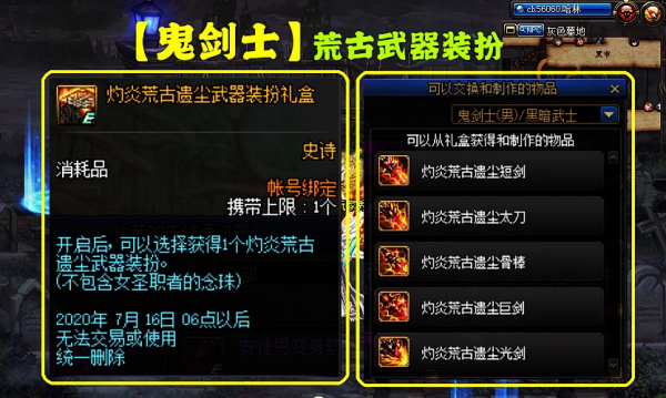 此次安徒恩除了翻牌奖励之外,还可以使用材料兑换灼炎荒古武器装扮,荒古武器是安徒恩版本时,玩家们最想获得的装备,但是由于版本更替的原因,有的玩家将其分解,也有玩家为了留恋将其保留了下来。