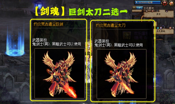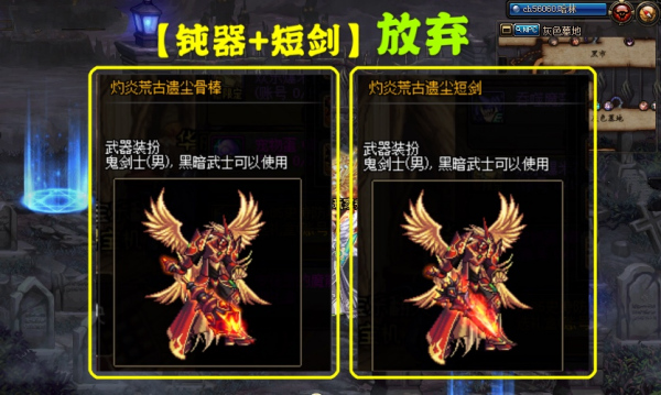对于鬼剑士来说,可以选择的荒古武器有五种:短剑、钝器、巨剑、太刀、光剑,可以通过翻牌获得,也可以使用10个材料兑换,