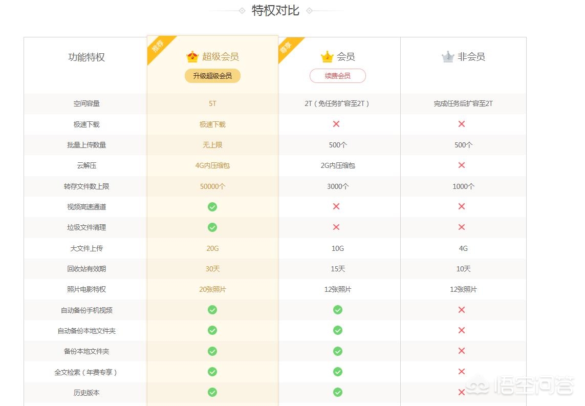 通俗一点,就是人民币玩家和普通玩家的区别,你想下载速度快点(对比非会员是极速),空间大点(2T升级到5T),转存文件数多点(1000到50000),上传文件大点(4G到20G),反悔时间(回收站有效期)长点(10天到30天),备份智能自动点(非会员无此功能),文件查重简单点(超级会员独有功能),云解压文件大点(从0G都4G),麻烦您开通超级会员。如果说贵真的不贵,每年269元,一个月20多块,一包低中档烟钱,还是值得的。如果你只是需要本地文件自动备份同步,你也可以像我一样开通普通会员,也是够用的。